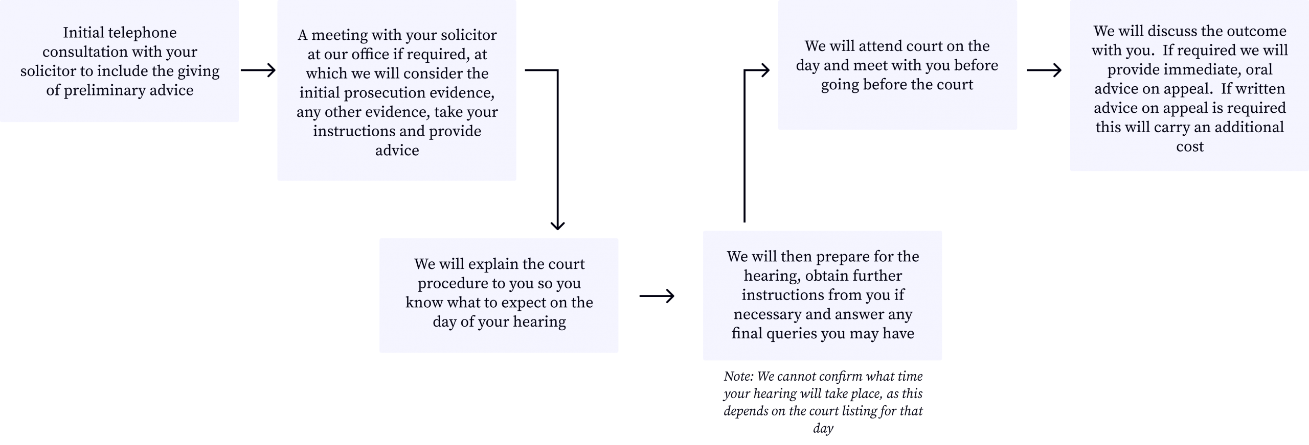 * Please note these fees apply to cases heard in London (within M25) and Essex (Basildon, Chelmsford and Southend) Magistrates Courts. Other courts may incur additional costs and travelling expenses – please contact us for a quote.